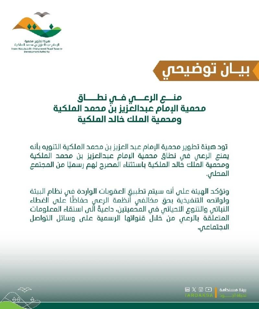 شدّدت هيئة تطوير محمية الإمام عبدالعزيز بن محمد الملكية على منع الرعي في نطاق محميتي: الإمام عبدالعزيز بن محمد الملكية، والملك خالد الملكية، باستثناء المصرح لهم رسميا من المجتمع المحلي.