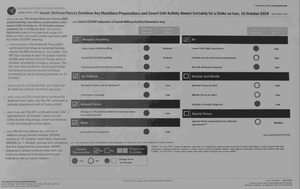 وكانت تلك الوثائق التي نسبت إلى وكالة الاستخبارات الأمريكية ووكالة الأمن القومي، كشفت أن إسرائيل تواصل تحريك أصولها العسكرية للقيام بضربة ردًا على الهجوم الصاروخي الباليستي الإيراني في الأول من أكتوبر، بمعاونة ما أطلق عليه «عيونها الخمس» أي الولايات المتحدة وبريطانيا العظمى وكندا ونيوزيلندا وأستراليا.