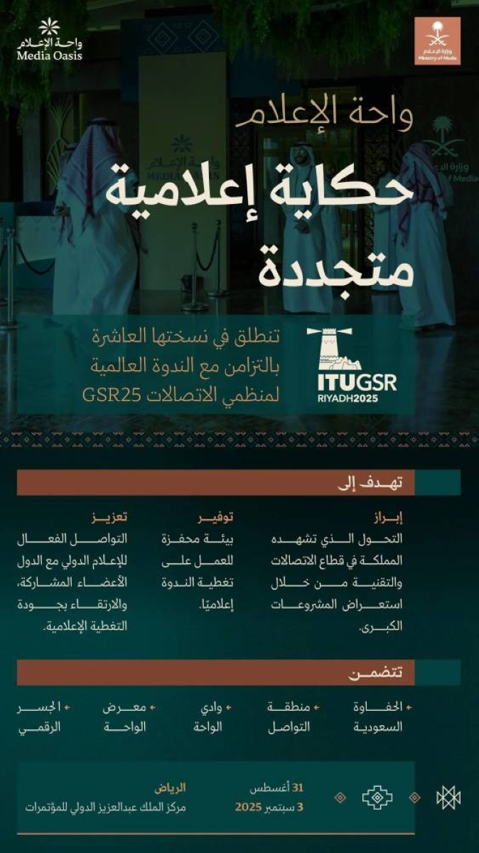أعلنت وزارة الإعلام إقامة «واحة الإعلام»، بالشراكة مع هيئة الاتصالات والفضاء والتقنية خلال الفترة من 31 أغسطس – 3 سبتمبر 2025، في مركز الملك عبدالعزيز للمؤتمرات بمدينة الرياض، تزامناً مع أعمال الندوة العالمية لمنظمي الاتصالات (GSR25).