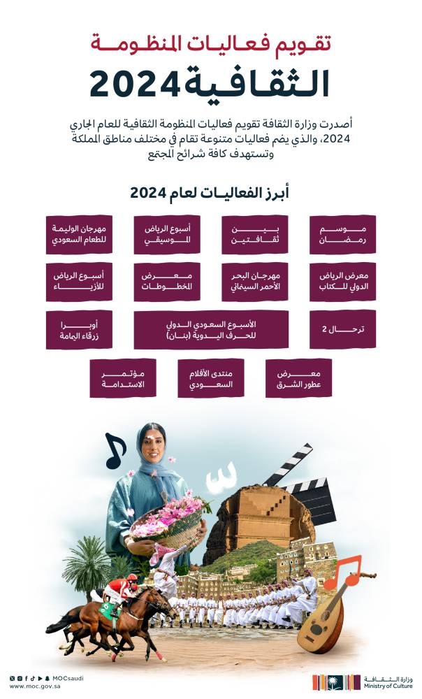 أصدرت وزارة الثقافة اليوم تقويم فعاليات المنظومة الثقافية للعام الحالي 2024، الذي يضم فعاليات منوّعة، تقام في مختلف مناطق المملكة، وتستهدف شرائح المجتمع كافة.