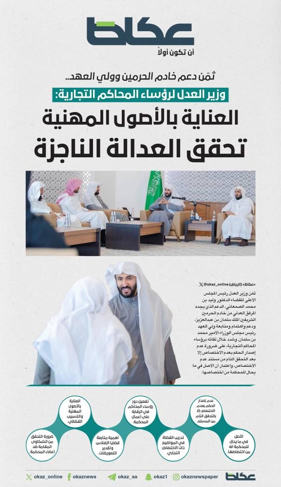 وأكد وزير العدل على رؤساء المحاكم ضرورة العناية بالأصول المهنية والتي تتمثل في التصور، التجرد، الاستقلال، استشعار المسؤولية، الحياد، المحافظة على الضمانات، الأمانة، وحسن التعامل، ما يسهم في تجويد الأعمال والمخرجات، ورفع سقف الإنجاز، وتحقيق العدالة الناجزة.