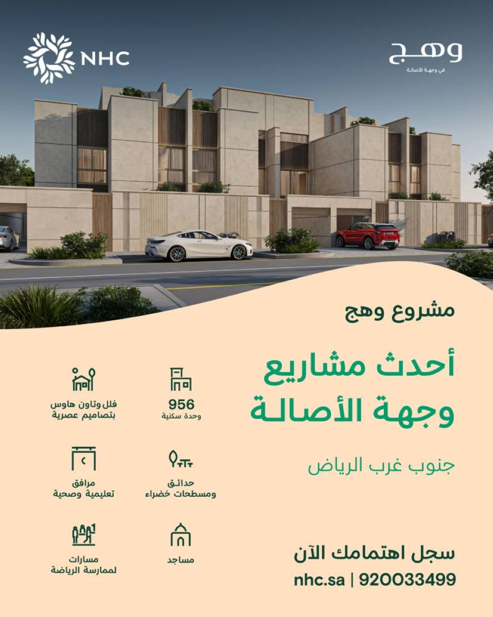 كما تدعو «NHC» الراغبين في تسجيل الاهتمام بالمشروع والاطلاع على كافة التفاصيل إلى زيارة موقع الشركة الإلكتروني من خلال الرابط التالي: https://nhc.sa/ar/register-interest/Wahaj/