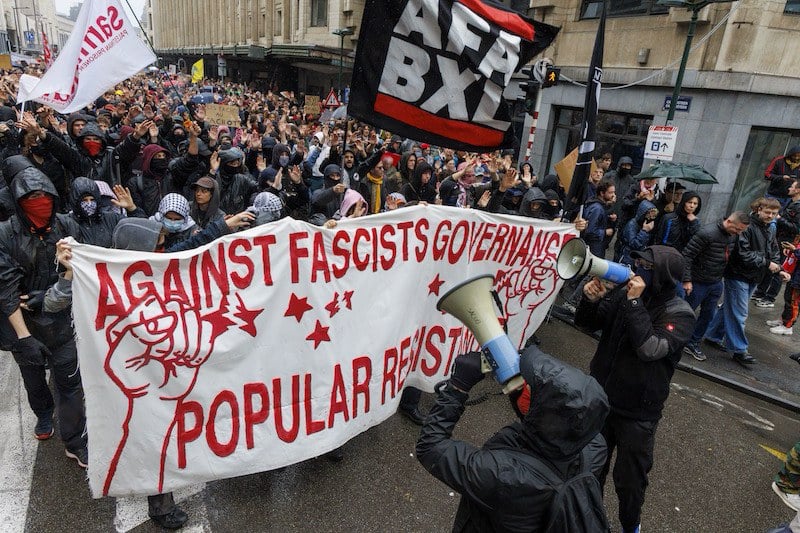 تحت الأمطار سار المتظاهرون في شوارع العاصمة البلجيكية تلبية لدعوة من “التنسيقية البلجيكية المناهضة للفاشية”، وهو تحالف يضم حوالي عشرين منظمة، وصولا إلى ساحة لوكسمبورغ أمام مقر البرلمان الأوروبي.