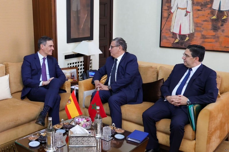 وكان رئيس الحكومة الإسبانية قد حل بالمغرب، الأربعاء، في إطار زيارة عمل، وكان في استقباله رئيس الحكومة المغربية عزيز أخنوش.