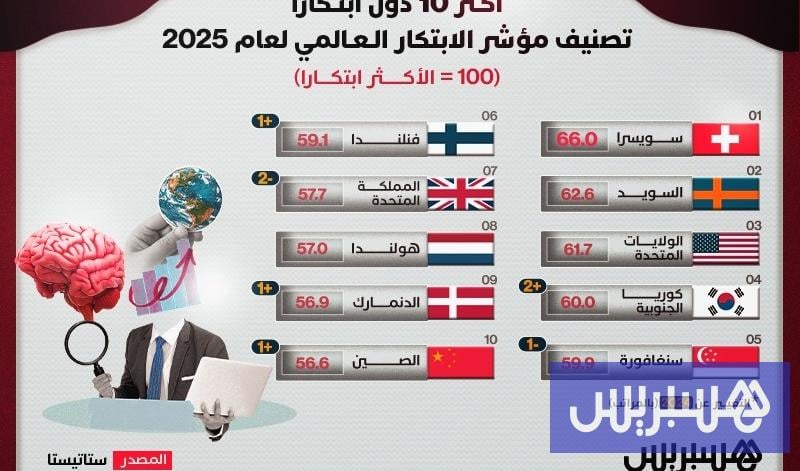 أكثر 10 دول ابتكارًا في العالم لعام 2025.. سويسرا تتصدر مؤشر الابتكار العالمي متقدمة على السويد والولايات المتحدة، فيما تنضم الصين إلى قائمة العشرة الأوائل.