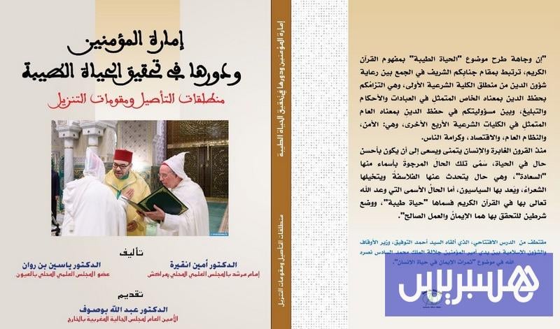 صدر مؤخرًا عن دار نشر مغربية كتاب جديد بعنوان “إمارة المؤمنين ودورها في تحقيق الحياة الطيبة: منطلقات التأصيل ومقومات التنزيل”، من تأليف الدكتور أمين انقيرة، الإمام المرشد بالمجلس العلمي المحلي بمراكش، والدكتور ياسين بن روان، عضو المجلس العلمي المحلي بالعيون، وذلك في مجلد من 400 صفحة، يتطرق فيه المؤلفان إلى أدوار مؤسسة إمارة المؤمنين في ترسيخ التدين المغربي الوسطي وتحقيق مقومات الحياة الطيبة في سياق العصر.