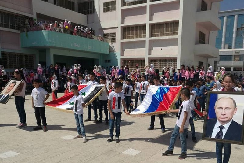 في عام 2015 تزامنت مشاركة القوات الروسية في الحرب السورية للدفاع عن نظام الأسد، مع إقرار وزارة التربية السورية للروسية كلغة ثانية رسمياً ضمن اللغات الأجنبية في التعليم السوري؛ ومن ثم، ربما سعى النظام السوري لتوفير دعم شعبي للروس على الأراضي السورية من خلال مأسسة تعليم اللغة الروسية في المدارس الحكومية، فضلاً عن رفع مستوى التعاون بين وزارتي التربية في البلدين، في سبيل التعرف أكثر على ثقافة الحليف العسكري الأول لدمشق.