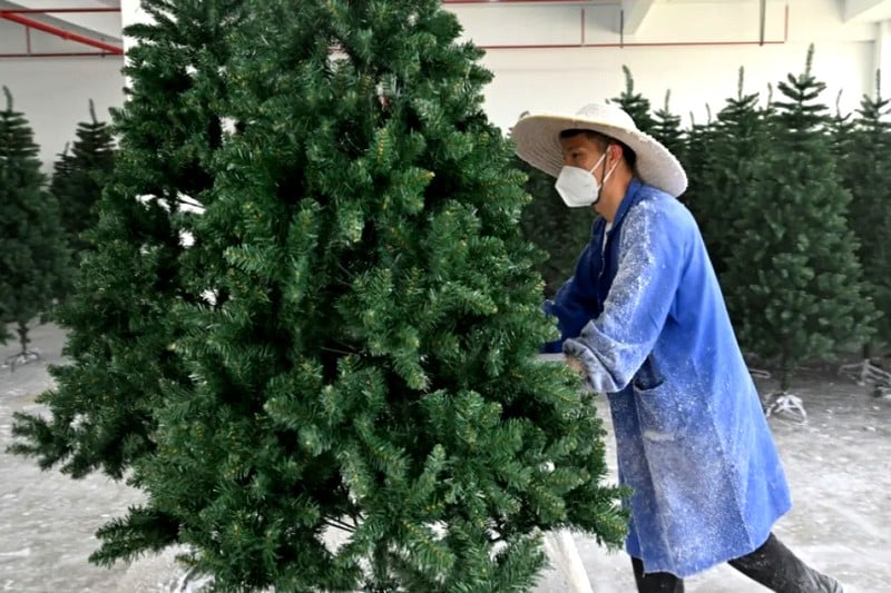 يجمع عمال في مصنع لأشجار عيد الميلاد شرقي الصين في يوم ربيعي حار أكواما من الأغصان، ويطلون إبر الصنوبر البلاستيكية باللون الأبيض، بينما يواجه قطاع التصدير تهديدا بسبب رسوم دونالد ترامب الجمركية.