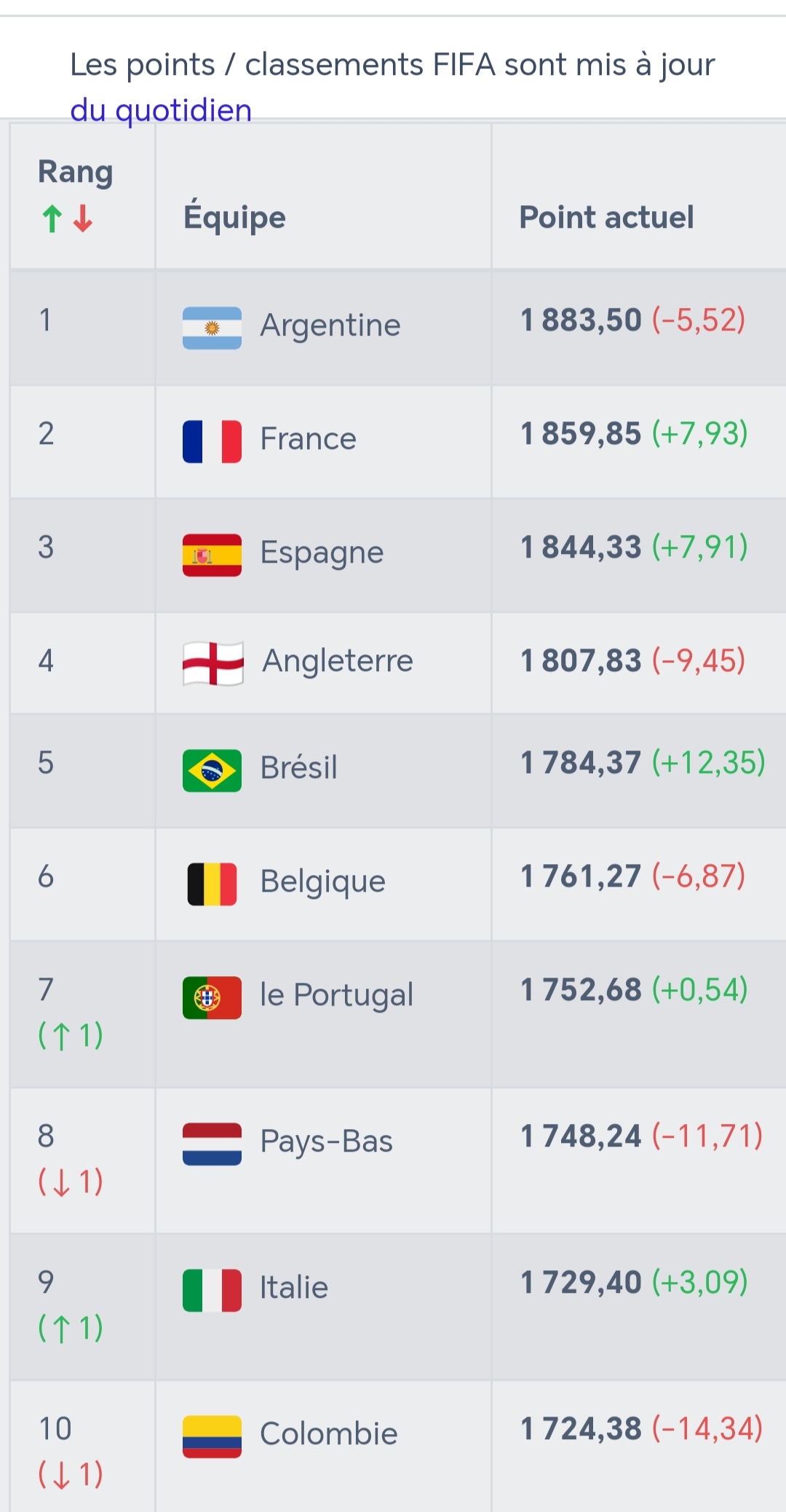 وعلى مستوى العشر الأوائل، حافظ المنتخب الأرجنتيني على صدارة التصنيف، رغم افتقاده لـ5.42 نقطة، في الوقت الذي صعد فيه المنتخب البرتغالي بمركز، ليصبح في الصف السابع بما مجموعه 1752.68، بينما تراجع المنتخب الهولندي والكولومبي بمركز، مقابل صعود إيطاليا برتبة واحدة.