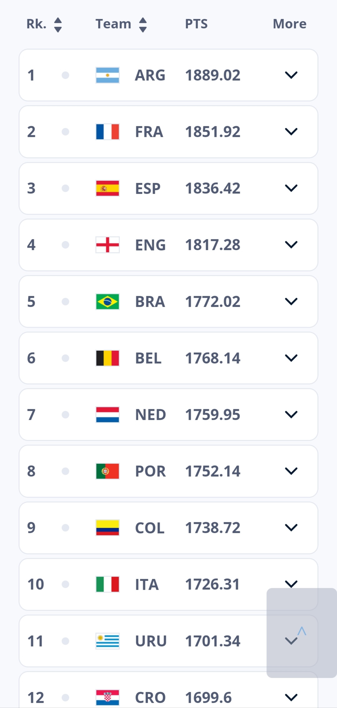 وعلى مستوى العشر الأوائل، حافظ المنتخب الأرجنتيني على صدارة التصنيف، رغم فقدانه 12.47 نقطة، في الوقت الذي لم يحدث أي تغيير في المراكز الأخرى، حيث بقيت المنتخبات بأكملها في ترتيبها الذي كان في التصنيف الماضي، في ظل انتصارها خلال مبارياتها، سواء في دوري الأمم الأوروبية، أو تصفيات كأس العالم 2026.