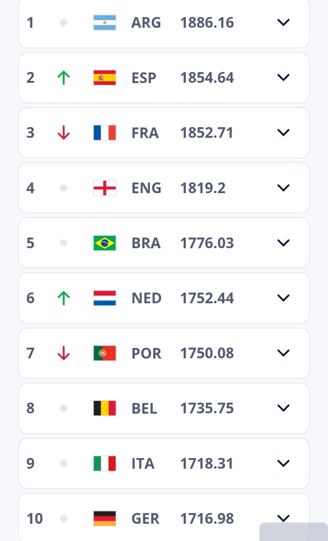 وعلى مستوى العشر الأوائل، حافظ المنتخب الأرجنتيني على صدارة التصنيف، مسجلا 18.91 نقطة إضافية، في الوقت الذي صعدت إسبانيا إلى الوصافة، وهولندا إلى الصف السادس، مقابل تراجع فرنسا إلى المركز الثالث، والبرتغال إلى السابع، فيما حافظت باقي المنتخبات على مراكزها، ويتعلق الأمر بكل من إنجلترا الرابع، والبرازيل الخامس، وبلجيكا الثامنً وإيطاليا التاسع، وألمانيا العاشر.