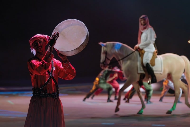 بين فارسٍ يضع الشماغ ويجول على حصانه عبر مواقع سياحية، ورجال يرقصون بالزي التقليدي أو نسوة بحجابهن الأسود يقدّمن لوحة فنية، تجسّد خشبة مسرح في الرياض توجّها سعوديا لتنظيم عروض عصرية تستلهم التراث المحلي.