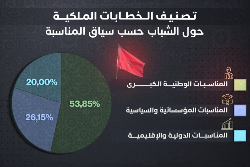تهيمن “المناسبات الوطنية الكبرى” على الحصة الأكبر بنسبة 53.85 في المائة. وتشمل هذه الفئة الخطابات الموجهة للأمة في مناسبات ذات رمزية عالية؛ مما يرسخ قضايا الشباب كملف سيادي واستراتيجي يرتبط بمستقبل وهوية الدولة.