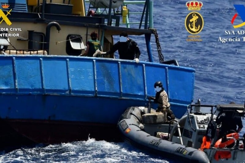 وبدعم من القوات المسلحة الإسبانية، نفذت وحدة التدخل الخاصة التابعة للحرس المدني عملية اقتحام للزورق في المياه الدولية غرب جزر الكناري، بينما أظهرت المعاينة أن الزورق كان في حالة متدهورة، مع وجود ثغرات خطيرة في إجراءات السلامة؛ مما شكل خطرا كبيرا على الطاقم المكون من أربعة بنغاليين وفنزويلي واحد، الذين تم توقيفهم على الفور كمشتبه فيهم بالتهريب الدولي للمخدرات.