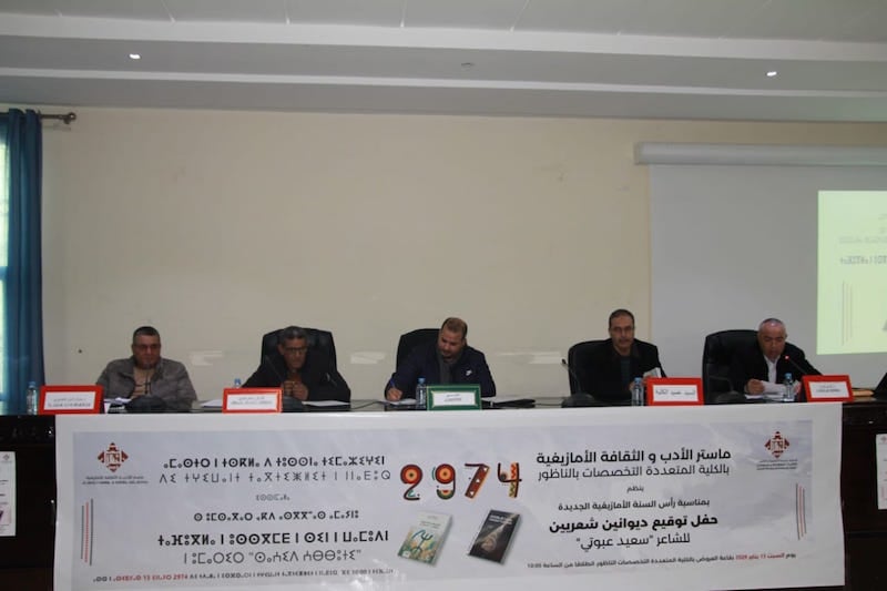 احتفالا بالسنة الأمازيغية الجديدة، احتضنت قاعة النّدوات التابعة للكلية متعددة التخصصات بالناظور، السبت، حفل توقيع ديواني “تيسٓكناف نْ وُجنا” و”تْغويّيت ن تالست” للشّاعر الأمازيغي سعيد العبوتي.