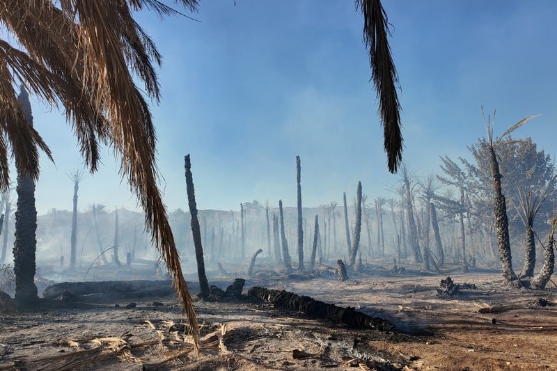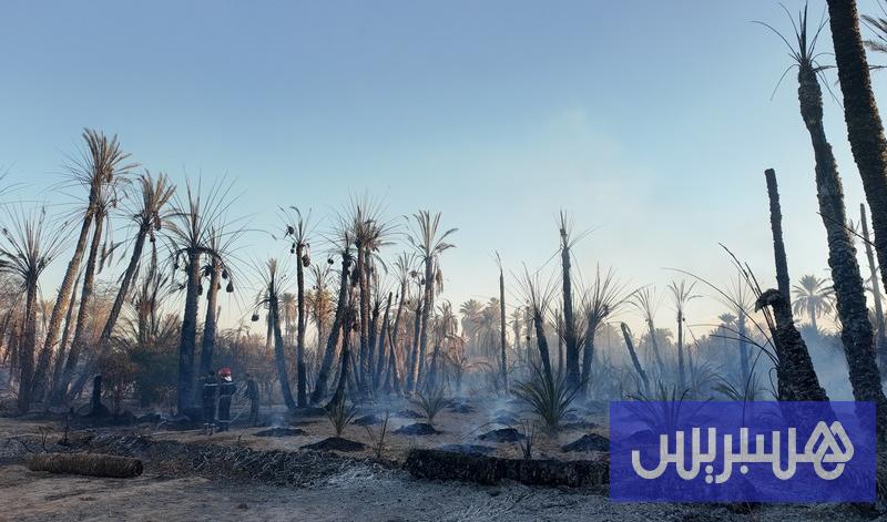 وعلى الرغم من الجهود الأولية لإخماد هذا الحريق، الذي انطلقت شرارته الأولى منذ أول أمس مس الأربعاء، إلا أن عامل الرياح القوية والأعشاب اليابسة تسبب في عودة النيران مساء أمس الخميس، مما استدعى تدخلا عاجلا ومكثفا، وتكللت جهود الإخماد بالنجاح بفضل التنسيق والتعاون الوثيق بين السلطات الأمنية والساكنة المحلية من دون تسجيل إصابات بشرية، في المقابل تم تسجيل خسائر كبيرة ومهمة في أشجار النخيل.