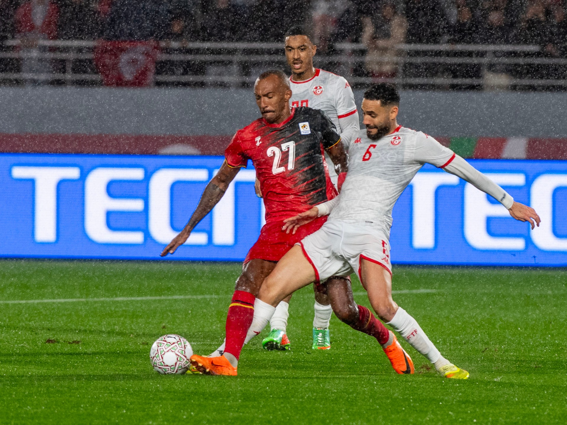 وقال الطرابلسي “بعد 3 ساعات من الأمطار الغزيرة بقيت أرضية الملعب في حالة جيدة جدا. شكرا لهم، فقد سمح لنا ذلك بتقديم كرة القدم التي نحبها”.