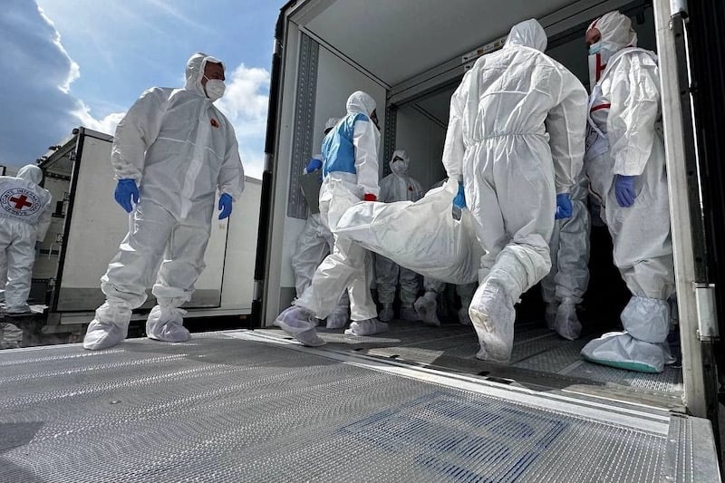 ونشر ميدنسكي صورا تظهر أشخاصا يرتدون ملابس طبية بيضاء ويضعون أكياس جثث في شاحنات مبردة.