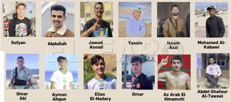 إلياس الحاضري (18 عامًا، من شفشاون)، أيمن أحكون (17 عامًا، من تاونات)، عمر آكي (17 عامًا، ميكانيكي من طنجة)، محمد الكباوي (من الجديدة)، عصام عزي (من الفنيدق)، ياسين (17 عامًا، من المحمدية)، جواد أسود (18 عامًا، من مرتيل)، عبد الله (22 عامًا، من الجديدة)، سفيان (20 عامًا، من الجديدة)، أيوب يامونين (18 عامًا، من صفرو).