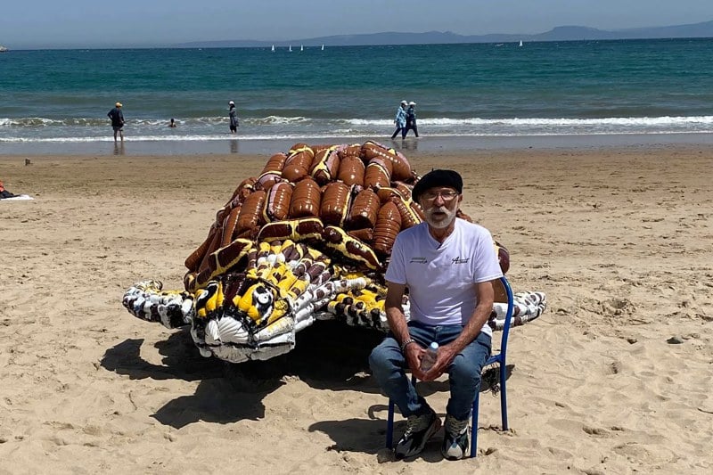 ومن المتلاشيات البلاستيكية صنع الفنان المغربي المختار غيلان مجسّم سلحفاة بحرية ضخمة، بعمل استمر ثمانية أيام “لتسليط الضوء على التهديد الخطير الذي تشكله القنينات البلاستيكية على سلاحف البحر، التي قد تبتلعها عن طريق الخطأ؛ مما يؤدي إلى الاختناق أو الموت جوعا”.