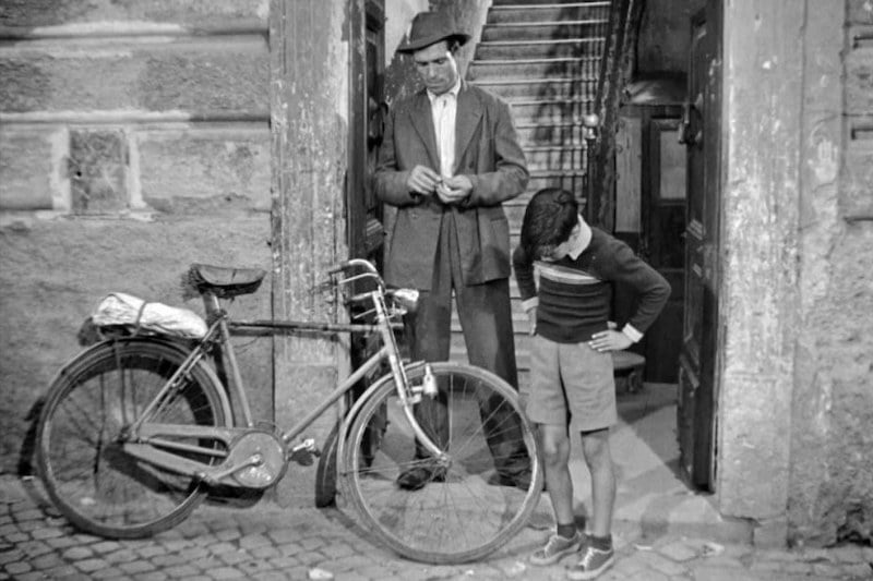 وتنبض روما ما بعد الحرب في فيلم “سارقو الدراجات” (1948) للمخرج الإيطالي فيتوريو دي سيكا، بالحزن والكرامة، حين يركض الأب والابن خلف دراجة مسروقة، لا بحثًا عن وسيلة، بل عن لقمة العيش. وتتحول الدراجة إلى رمز للكرامة، إلى جسر بين الطفولة والنجاة، إلى أمل هشّ يتكسر في شوارع الخراب بعد الحرب. ويمثل الفيلم قمة الواقعية الإيطالية، وأن أنطونيو صار رمزًا للكفاح البشري ضد الظروف المهشّمة. ولا تتكلم الدراجة الهوائية، لكنها تصرخ في وجه الفقر، وتبكي حين تُسرق، وتنهار حين تُفقد.