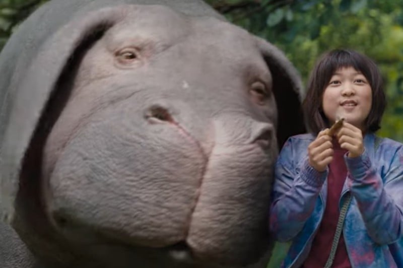 ويصور المخرج في فيلم OKja (2017) علاقة طفلة بكائن لطيف ومعدل وراثيًا، ويكمن العمق في فضح جشع الشركات التي تصنع الأمل وتسوّقه كمنتج. ولا يمثل الحيوان سوى كائن خيالي، فهو مرآة للوحشية البشرية. وتقف البطلة في وجه قوة لا تفهم الرحمة. ومشاهد الذبح الصناعي في نهاية الفيلم لا تترك للمشاهد مهربًا، بل تصرخ في وجهه: “هل هذا ما تأكله؟ هل هذه هي الإنسانية التي تدافع عنها؟”.