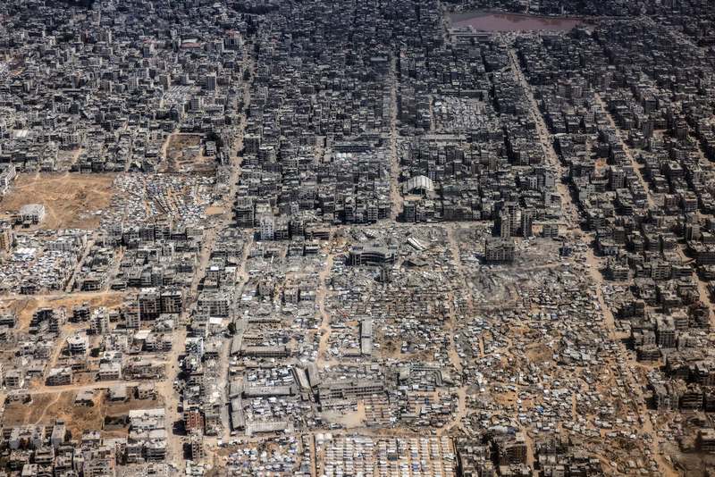 ومن على متن الطائرة ظهرت مشاهد مروعة: أحياء كاملة من المباني المنهارة، ومساحات شاسعة تملؤها الخيام البيضاء التي أقامها النازحون، حيث لا أثر يذكر لما كانت عليه الحياة قبل الحرب. الامتداد العمراني للقطاع بدا مهشمًا إلى حد كبير، وبدت آثار القصف واضحة في كل زاوية، بينما حلّت الخيام مكان المدارس والمراكز الصحية والمساجد.