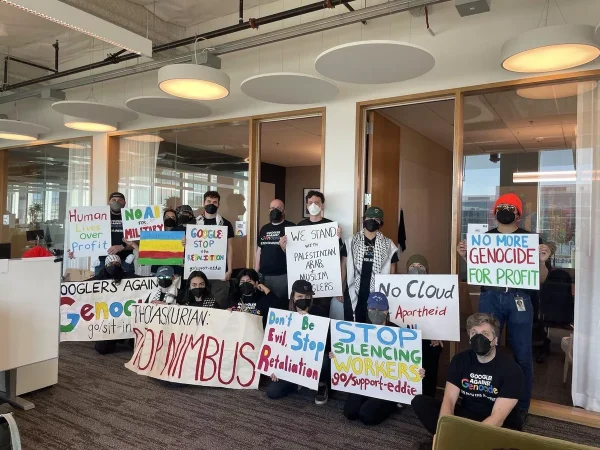 ونظمت الاحتجاج الثلاثاء مجموعة « لا تكنولوجيا لنظام فصل عنصري » التي تعارض منذ مدة طويلة « مشروع نيمبوس »، وهو عقد مشترك بين غوغل وأمازون بقيمة 1,2 مليار دولار لتوفير الخدمات السحابية للحكومة الإسرائيلية.