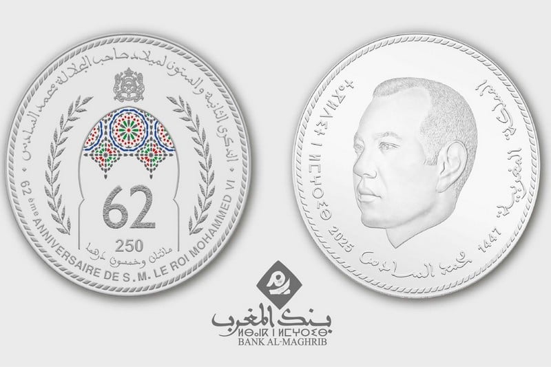 أصدر بنك المغرب قطعة نقدية تذكارية فضية من فئة 250 درهما، وذلك تخليدا للذكرى الثانية والستين لميلاد الملك محمد السادس.