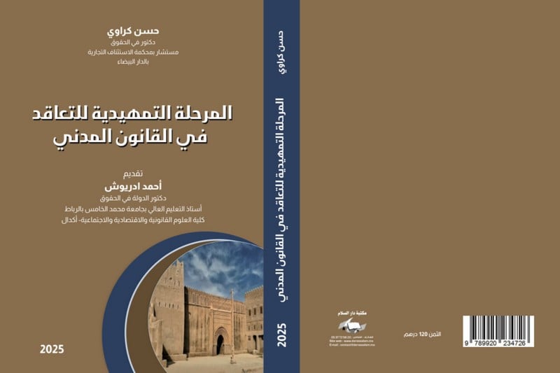 عن مكتبة دار السلام بالرباط، صدر حديثا مؤلف للأكاديمي والباحث حسن كراوي، المستشار بمحكمة الاستئناف التجارية بالدار البيضاء، يحمل عنوان “المرحلة التمهيدية للتعاقد في القانون المدني”، اختار له في الغلاف صورة لباب قصر مزكيدة بمدينة مولاي علي الشريف التي تعتبر مهد الدولة العلوية.