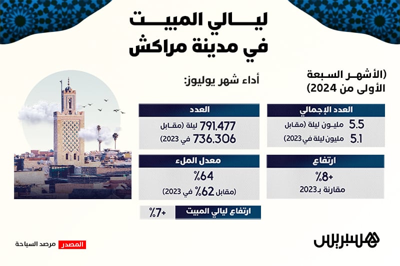 ليالي المبيت في مدينة مراكش خلال الأشهر السبعة الأولى من سنة 2024