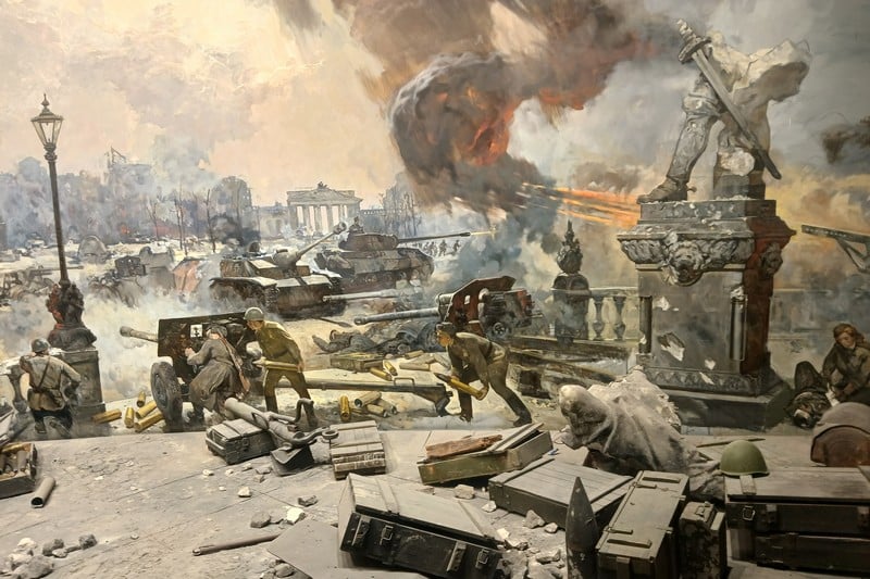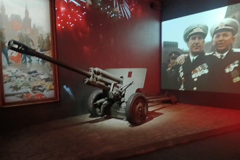 ولا شيء هنا يضاهي الوقوف أمام الشاشة التفاعلية التي تجسد آخر لحظات الحرب العالمية الثانية، حين دخلت عناصر الجيش السوفييتي إلى العاصمة الألمانية برلين ورفعت علم بلادها فوق “الرايخستاغ” (مبنى البرلمان الألماني السابق)؛ بينما اهتزت موسكو وتعالت صرخات الفرح بالنصر الممزوجة بالدمع المتسايل على خدود كل من فقد شخصا عزيزا وعاش كابوس الحرب التي حولت حياته إلى جحيم فوق الأرض.