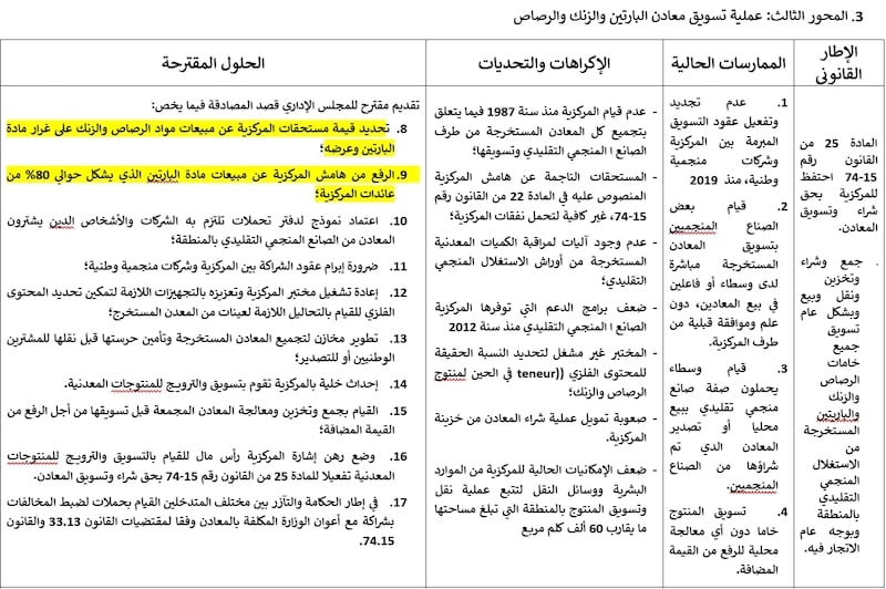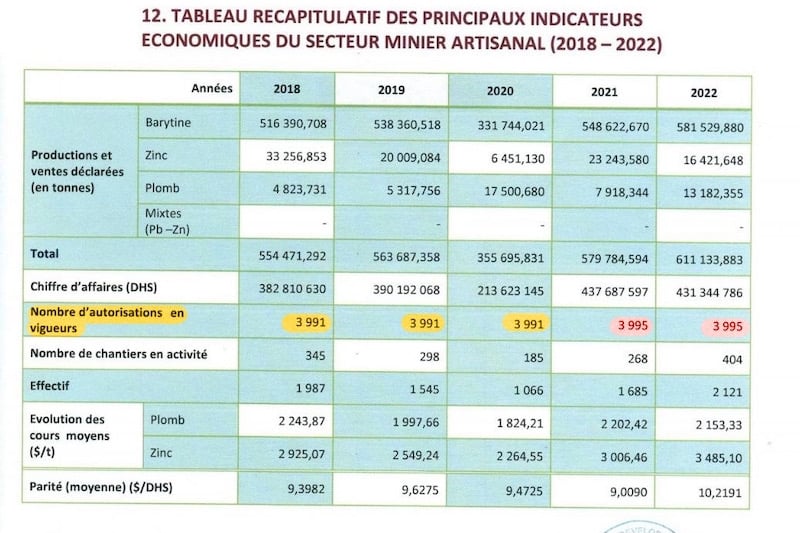 كما نبّه إلى “المنع القانوني الذي يفرضه ظهير 1960 في وجه المتدخلين الخواص للقيام باستثمارات معدنية في المنطقة”، وأقر بأن “طرق استغلال العروق والجيوب المُمعْدنة غير عقلانية”، ما يؤدي إلى “ضياع كميات مهمة أثناء عمليات التقييم”، وذكر أن “أشغال الاستغلال لا تحترم ضوابط المهنة، لا سيما فيما يخص الصحة والسلامة وحماية البيئة”.