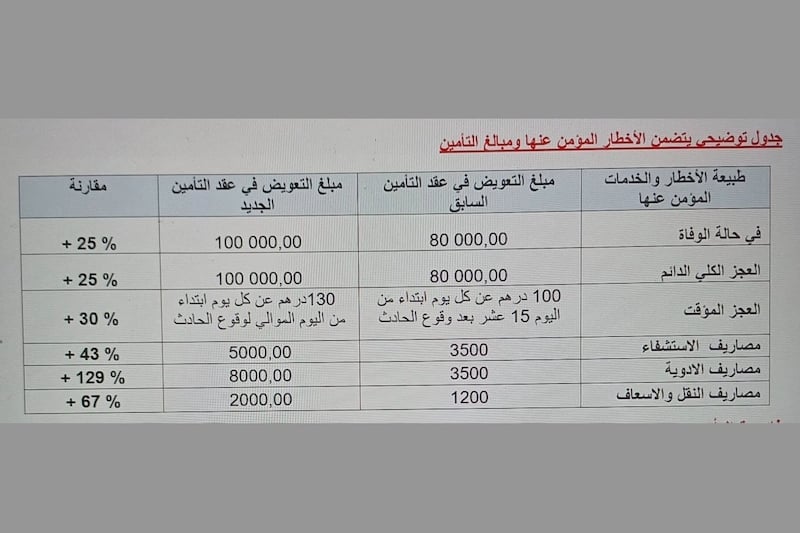 حقّق العقد الجديد زيادة ملحوظة في مبلغ التعويضات وأقساط التأمين المخصصة للمؤمن لهم أو ذوي الحقوق في حالة الوفاة، بحيث ارتفعت من 80 ألف درهم إلى 100 ألف درهم. المستجدات ستساهم في تقليص التكلفة الإجمالية لفاتورة التأمين بـ316 ألفا و575 درهما، لأن الفاتورة السابقة التي كانت تدفعها المركزية سنويا لفائدة شركة التأمين هي مليون و685 ألفا و100 درهم، لكنها انخفضت بموجب العقد الجديد إلى مليون و368 ألفا و525 درهما، أي بهامش فرق قيمته تقارب 19 بالمائة.