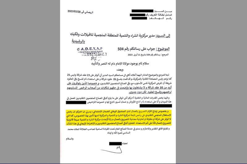 تأكد هذا الأمر لهسبريس عندما حصلنا على مراسلة وجهها منجمي إلى مدير “كاديطاف” السابق عبد الرحيم دينار، جاء فيها أن “رخص الاستغلال المنجمي التقليدي هي رخص تابعة للمركزية” وهي “لديها تأمين بهذا الخصوص”، وتابع المنجمي: “لا أتوفر على شركة أو مقاولة أو تعاونية معدنية للتصريح بالعمال، وإذا أوجدت المركزية صيغة قانونية لذلك، فأنا على أتم الاستعداد للتعاون”.