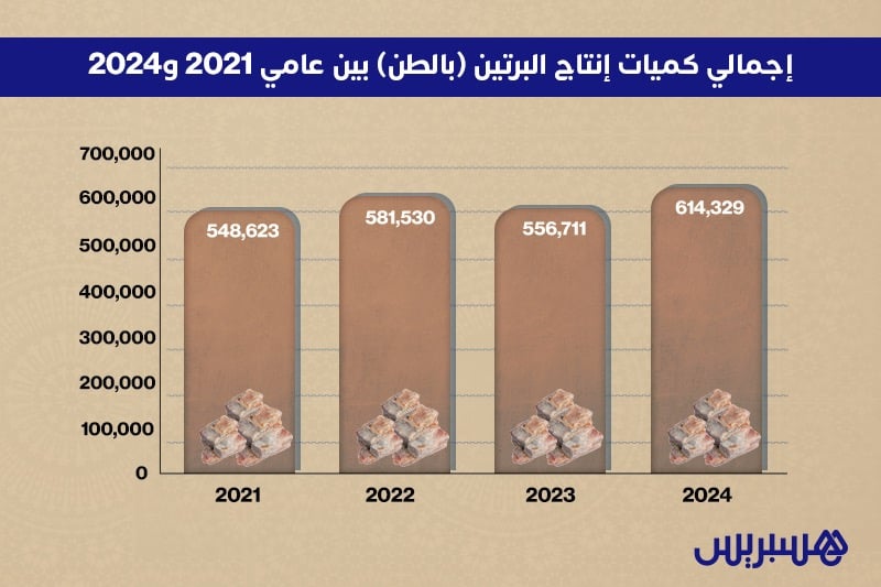 تكشف الأرقام كذلك أن الباريتين هو المعدن الوحيد الذي سجّل منحى تصاعديا مستمرا خلال الفترة الممتدة بين 2021 و2024، حيث ارتفع إنتاجه من 548,623 طنا سنة 2021 إلى 614,329 طنا في 2024، أي بزيادة 65,706 طن في ظرف 3 سنوات.