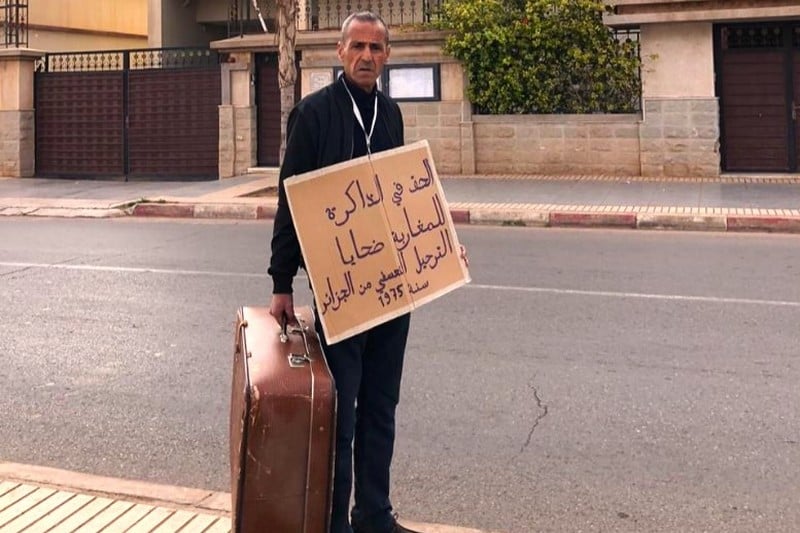 جمال العثماني وككل عام لا يمكن أن يفوّت هذه الذكرى دون أن يقف أمام القنصلية الجزائرية بوجدة، للتذكير بهذه الواقعة، و”من أجل الحق في الذاكرة للمغاربة ضحايا الطرد التعسفي من الجزائر سنة 1975″، وهو المطلب الذي يحمله على لافتة فوق صدره، بينما يحمل في يده حقيبة سفر بنّية اللون، يقول إنها كل ما استطاع أن يحمله معه أثناء طرده، ويصفها بـ”الشاهدة على الجريمة”.