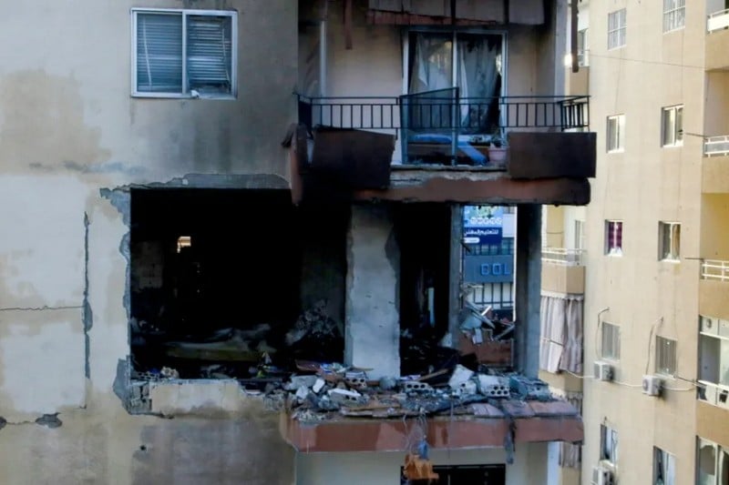 ورأى مراسل فرانس برس شقة في الطابق الرابع من أحد المباني مدمّرة؛ بينما اندلعت فيها النيران. كما رأى الأضرار التي لحقت بأبنية مجاورة وعدد من المحال التجارية والسيارات القريبة.