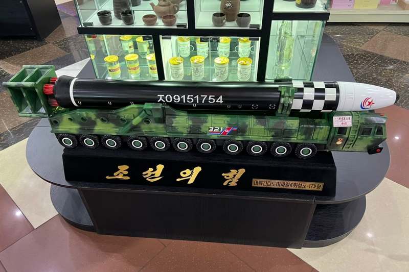 من بين الهدايا المعروضة للبيع نموذج بلاستيكي لصاروخ “هواسونغ-17” العابر للقارات، بسعر 465 دولارًا.