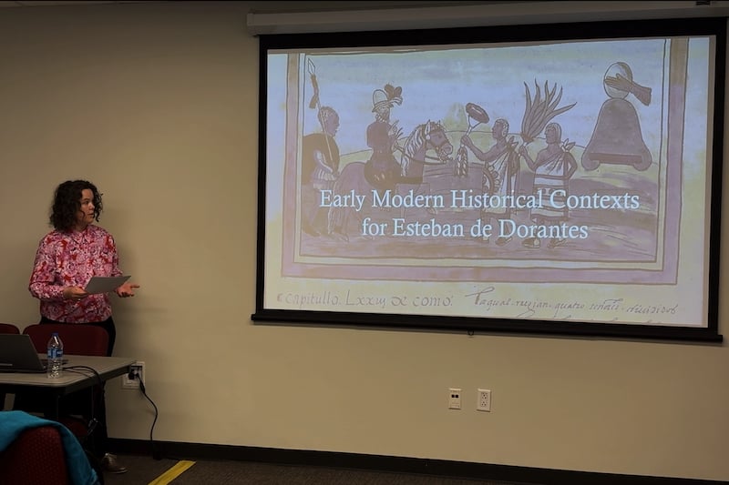 واستعرضت الدكتورة بجامعة هيوستن جانبا من الرحلات والمخطوطات التي توثق وجود علاقات عبر المحيط الهادئ والأطلسي، وظهور شخصيات من أصول شمال إفريقية وإفريقية مبكرة في الأمريكيتين، مثل غاسبار من آسفي وخوان جاريدو وبياتريث دي بالاثيوس، وأشارت إلى كيفية تصوير استيفانيكو في السرد الإسباني كشخصية ثانوية، بينما تحاول الدراسات الحديثة إعادة تقديمه كقائد إستراتيجي سعى إلى الحرية ورفض العبودية، مجسداً نموذجاً للفاعلية الإفريقية المبكرة.