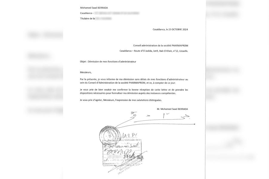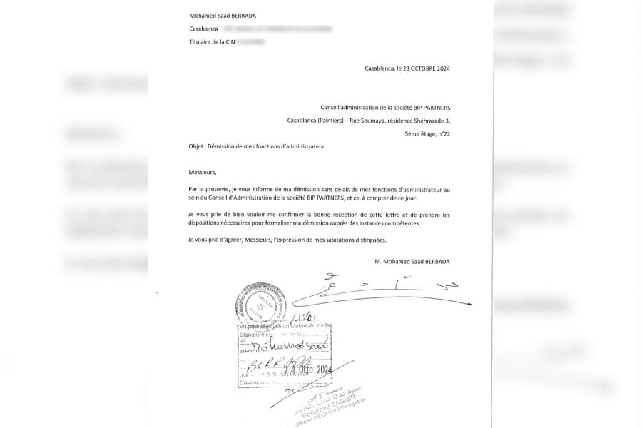 وأشارت الوثائق ذاتها، المصادق عليها لدى السلطات العمومية بتاريخ 24 أكتوبر من السنة نفسها، إلى أن محمدا سعد برادة أشعَرَ مجلس الإدارة وأعضاءه باستقالته دون أجل إخطار (sans délai) من وظائفه كعضو مُسيِّر في مجلسي الشركتين المذكورتين، داعيا إياهما إلى “اتخاذ الإجراءات اللازمة والمُتعيّن لتلقي الاستقالة وقبولها بشكل رسمي لدى الهيئات المختصة”.