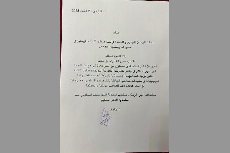 وأعلن منير القادري، في وثيقة اطلعت عليها هسبريس، عن استعداده الكامل للتعاون مع شقيقه معاذ القادري بودشيش في مهامه الجديدة شيخًا للطريقة القادرية البودشيشية، مشيرا إلى أنه “سيظل وفيا لتوجيهات وتعليمات صاحب الجلالة الملك محمد السادس، نصره الله وأيده، خادما وفيا للثوابت الدينية والوطنية”.