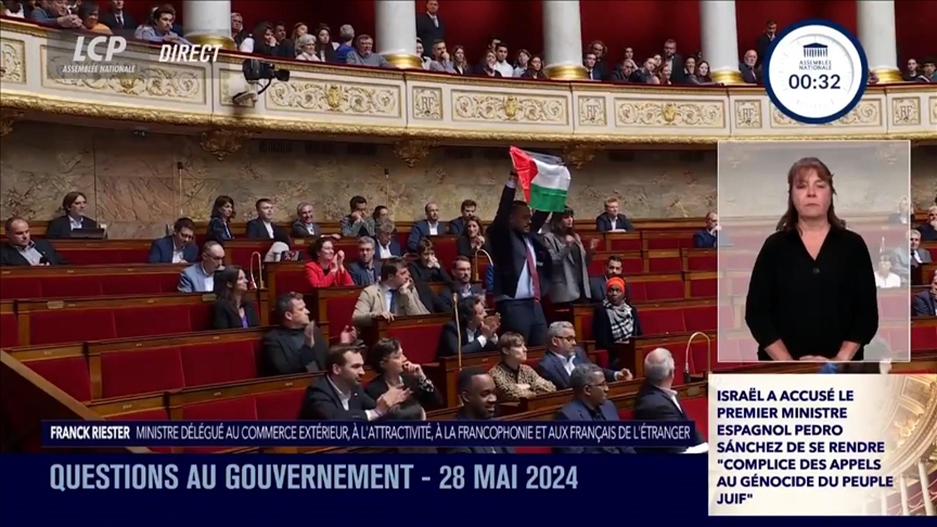 النائب عن حزب فرنسا الأبية المعارض سيباستيان ديلوغو رفع العلم الفلسطيني خلال جلسة للجمعية الوطنية (الغرفة الثانية في البرلمان)..