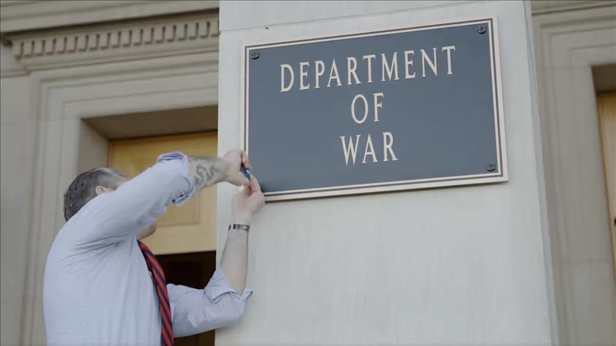 شاركها فيسبوك تويتر لينكدإن بينتيريست تيلقرام البريد الإلكتروني وزير الدفاع الأمريكي بيت هيغسيث علَّق شخصيا إحدى اللوحات البرونزية بالاسم الجديد للوزارة، بموجب القرار الصادر في سبتمبر.. المصدر: وكالات
