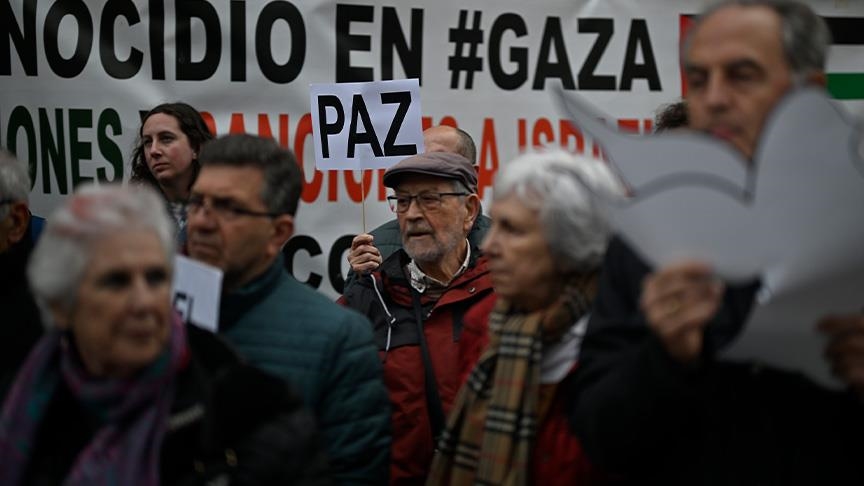 شاركها فيسبوك تويتر لينكدإن بينتيريست تيلقرام البريد الإلكتروني تجمع ممثلو الجمعيات أمام السفارة الإسرائيلية في مدريد وأطلقوا على تجمعهم “باسم الإنسانية، أوقفوا الإبادة الجماعية”.. المصدر: وكالات