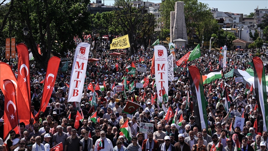 وبدأ المشاركون مسيرتهم نحو مسجد آيا صوفيا الكبير، مُكبِّرين ومرددين هتافات مثل “إسرائيل قاتلة، اخرجي من فلسطين”.