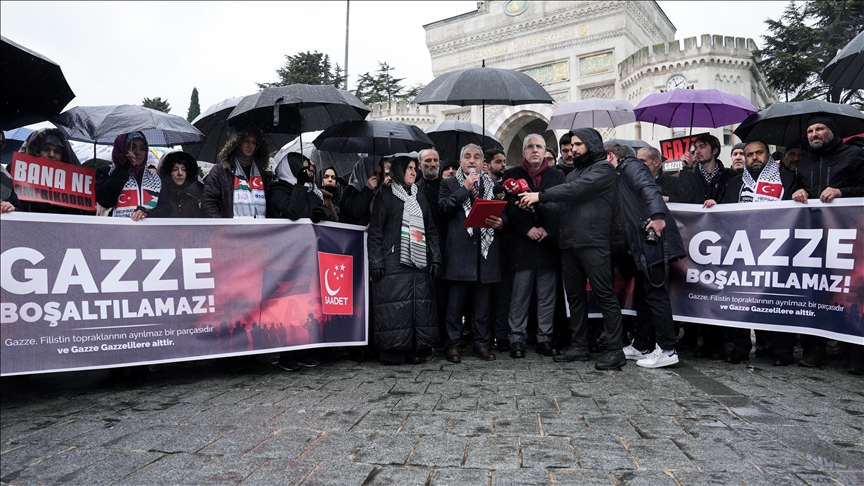 وقال مراسل الأناضول إن أعضاء فرع حزب السعادة في إسطنبول، تجمعوا في ميدان بيازيد للاحتجاج على خطة ترامب والتنديد بجرائم إسرائيل بحق الشعب الفلسطيني.