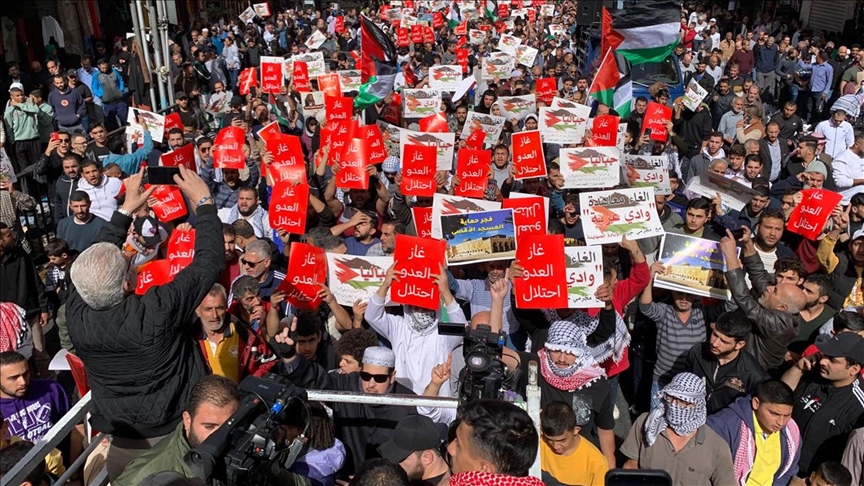 وطالب المشاركون بإلغاء اتفاقية السلام الموقعة بين الأردن وإسرائيل بالعام 1994، وذلك بهتافهم “وادي عربة مش (ليس) سلام.. وادي عربة استسلام”.