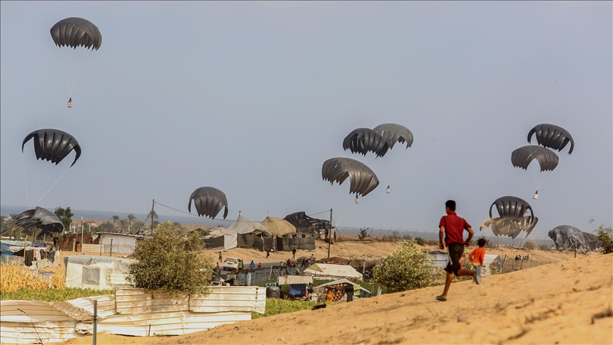 ونقلا عن شهود عيان، قال مراسل الأناضول إن طائرات لم تُعرف هويتها على الفور ألقت مساعدات إنسانية وإغاثية عبر مظلات فوق منطقة المواصي ببلدة القرارة الساحلية غربي خان يونس.