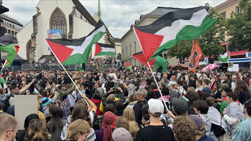 شاركها فيسبوك تويتر لينكدإن بينتيريست تيلقرام البريد الإلكتروني آلاف الأشخاص تجمعوا في ساحة بارفوسر بلاتز للمطالبة باستبعاد إسرائيل من المسابقة التي تحتضن بازل نسختها الـ69 هذا العام المصدر: وكالات